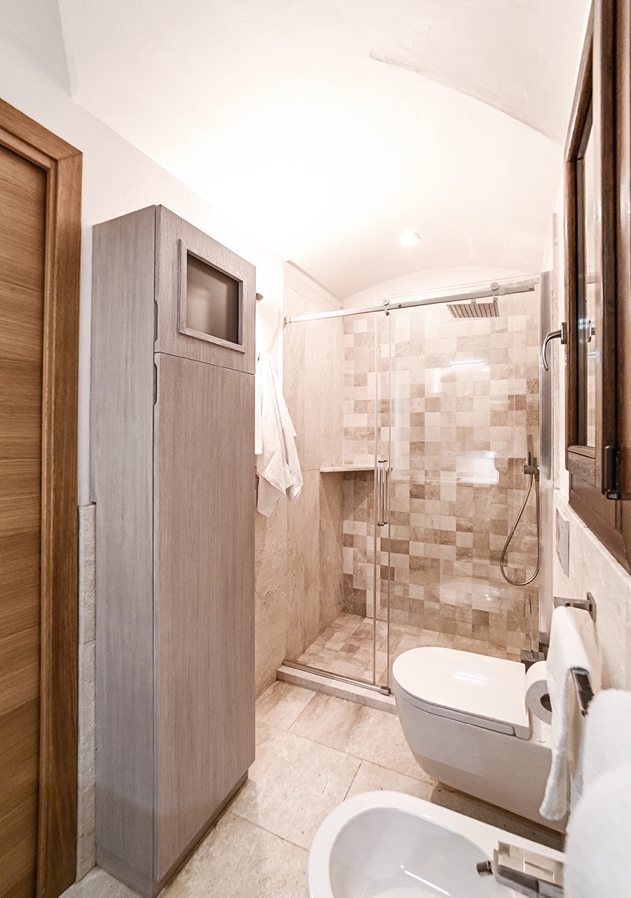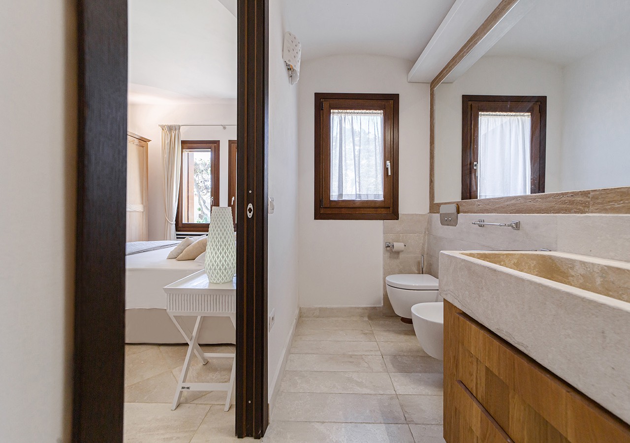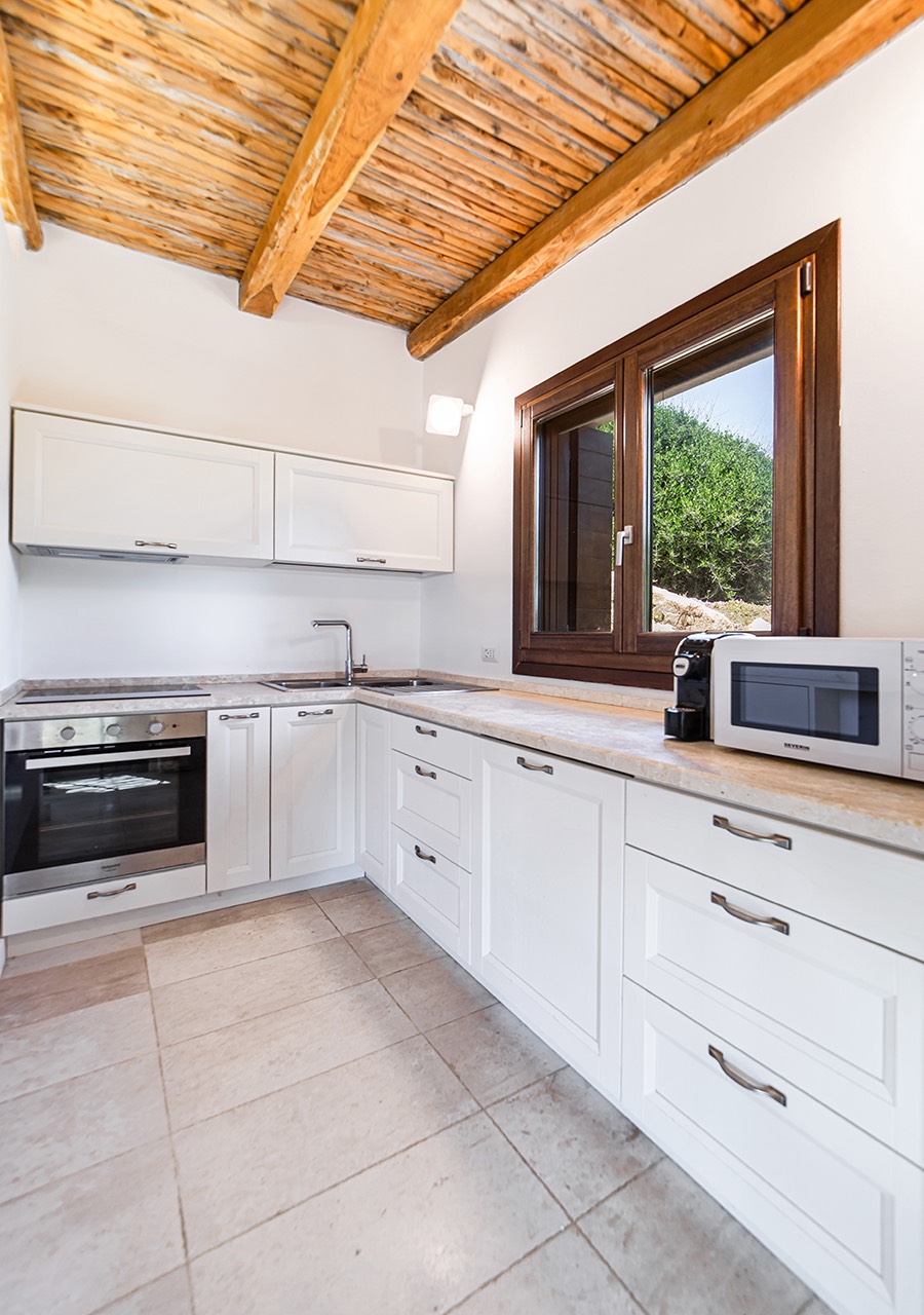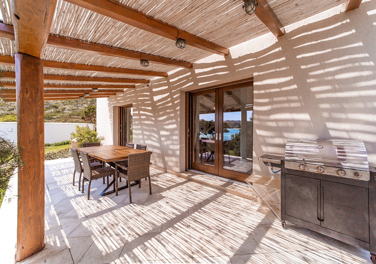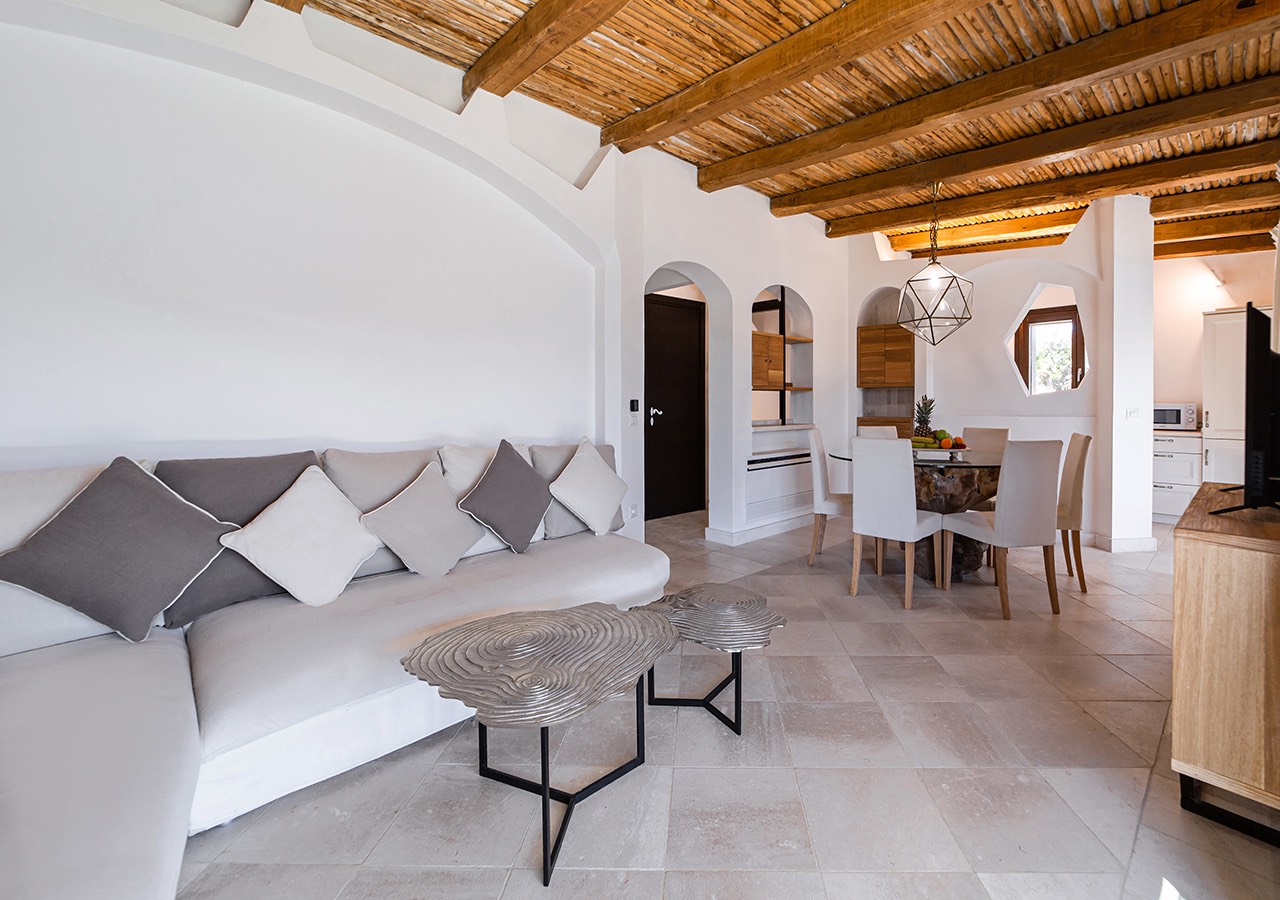 Nella villa principale troviamo ampio soggiorno vista mare con cucina attrezzata, camera matrimoniale con bagno ensuite, seconda camera matrimoniale, secondo bagno e terrazza attrezzata vista mare.